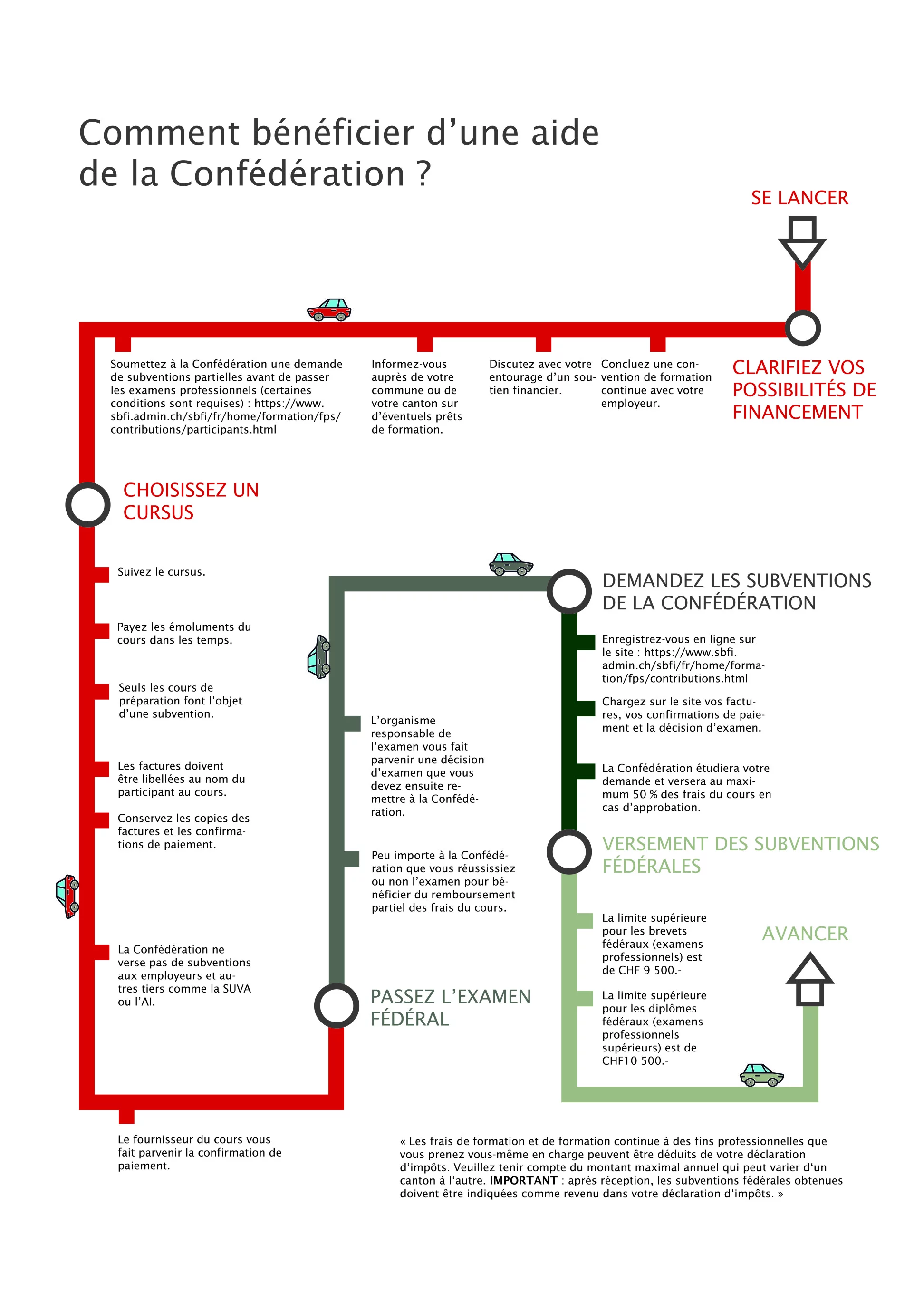 Depuis le début 2018, la Confédération soutient les participants à des cours destinés à les préparer à un examen fédéral. Elle prend en charge jusqu’à 50 % des émoluments du cours imputables avec un maximum de 9500 francs pour un examen professionnel (brevet fédéral) et 10 500 francs en cas d’examen professionnel supérieur (diplôme fédéral). Toute personne suivant plusieurs cours ou modules dans le cadre de sa préparation peut cumuler les frais jusqu’au montant maximum.